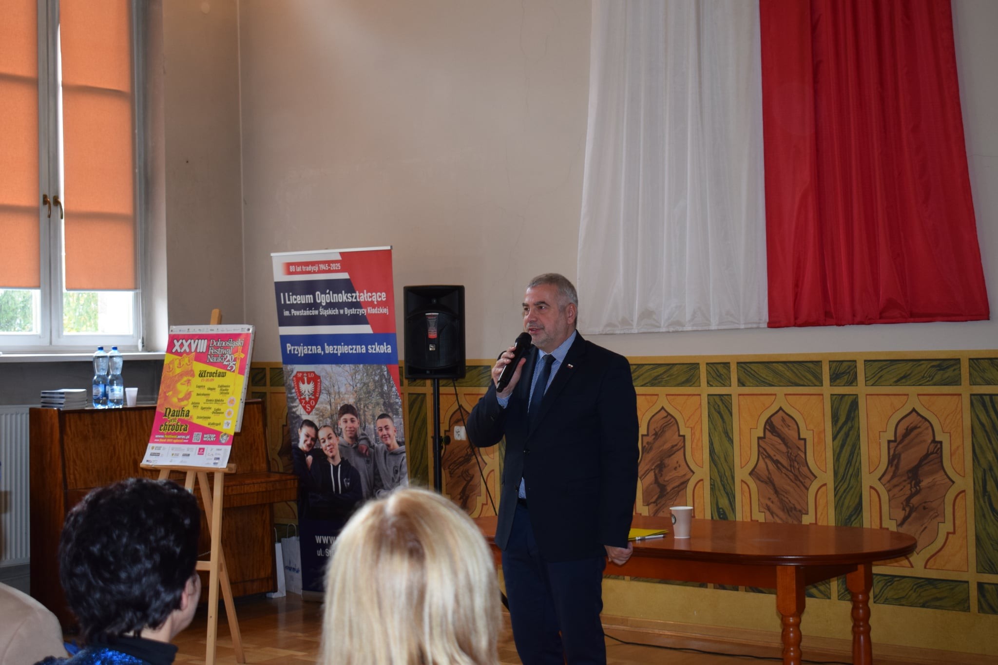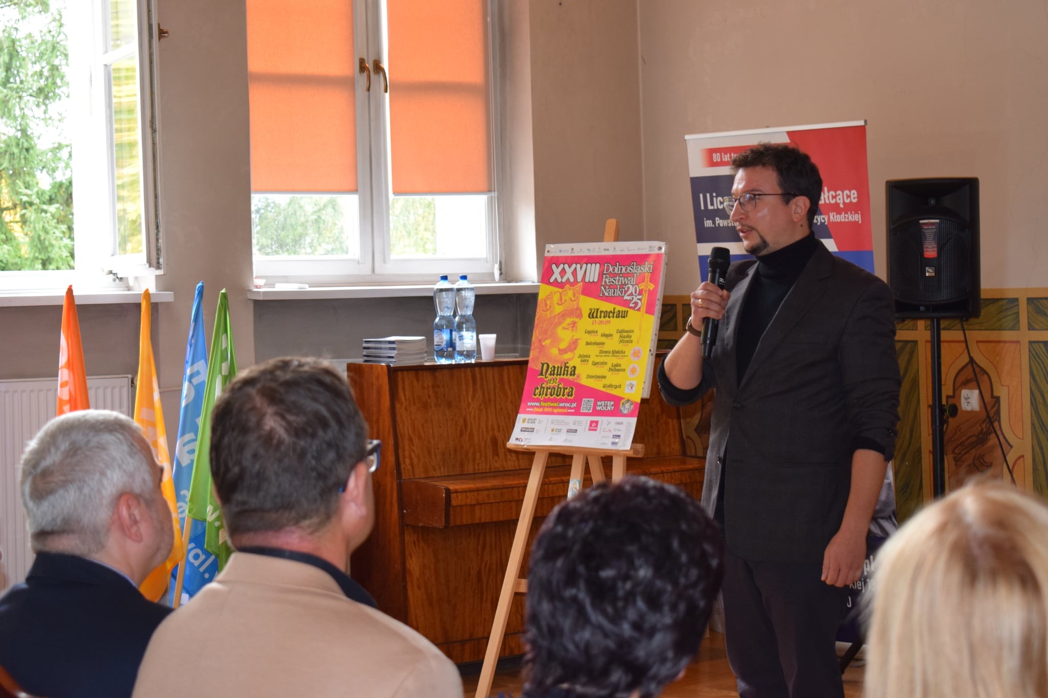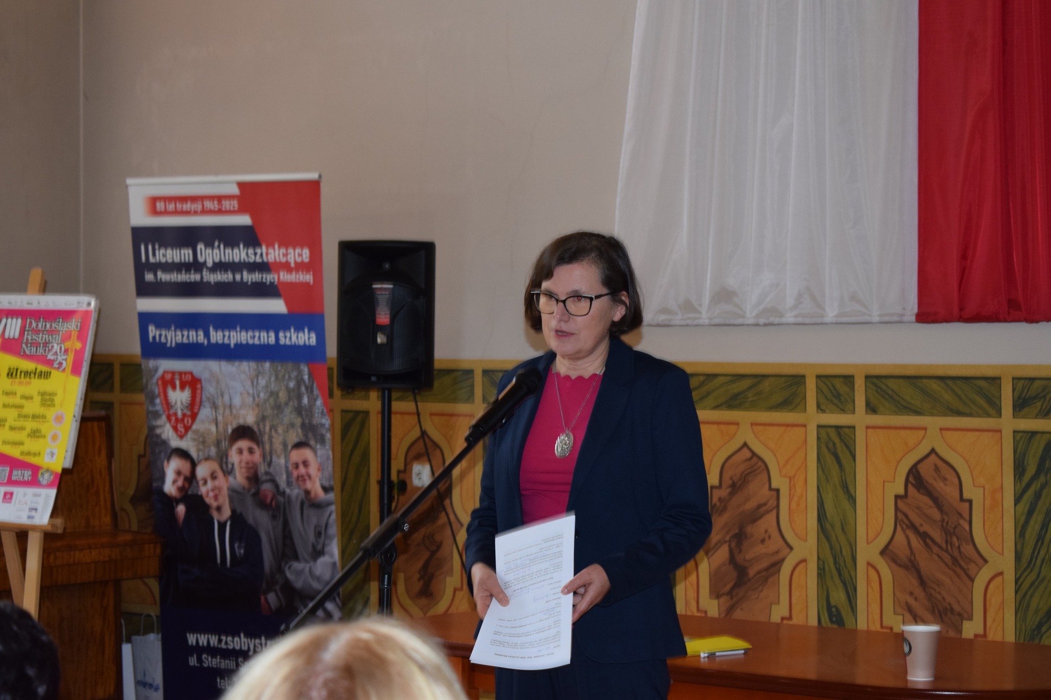 9 października 2025 roku w Zespole Szkół Ogólnokształcących w Bystrzycy Kłodzkiej odbyła się uroczysta inauguracja Dolnośląskiego Festiwalu Nauki pod koordynacją Sylwii Pierzchała-Ryznar oraz Marty Ankowskiej. W wydarzeniu uczestniczyli: Pani Renata Surma – Burmistrz Bystrzycy Kłodzkiej, Pan Paweł Popiel - dyrektor naszego ZSO, Pani Dorota Łakucewicz – Dyrektor Zespołu Szkół Ponadpodstawowych, Pan Zbigniew Kania – Prezes Bystrzyckiego Związku Sybiraków, Pan Janusz Kobryń, Pan Jerzy Rudnicki z Instytutu Pamięci Narodowej. Wykład inauguracyjny wygłosiła Pani prof. Uniwersytetu Wrocławskiego Małgorzata Ruchniewicz, która w niezwykle interesujący sposób przybliżyła uczestnikom tematykę historyczną. Podczas pierwszego dnia Festiwalu odbyło się również wiele innych ciekawych wykładów prowadzonych przez zaproszonych prelegentów. Młodzież z dużym zaangażowaniem uczestniczyła w zajęciach, wychodząc z nich zadowolona, zainspirowana i bogatsza o nową wiedzę. Dzięki ogromnemu zaangażowaniu nauczycieli, pracowników szkoły oraz uczniów klasy IIIA mogliśmy uczestniczyć w fascynujących wykładach i pokazach naukowych, które stworzyły wyjątkową atmosferę naukowej pasji i odkrywania świata. Dzisiejsze wydarzenie stanowiło doskonały początek tegorocznej edycji Dolnośląskiego Festiwalu Nauki w naszej szkole